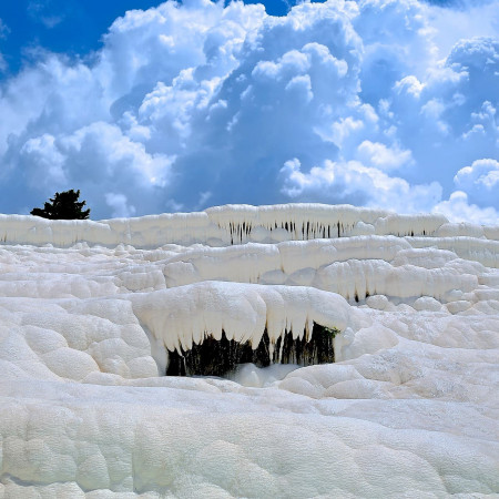 White travertine terraces, marvel at the white limestone terraces of Pamukkale. Due to the chemical properties in the water, pure white colored travertines and stepped water terraces have been created on the mountain slope.